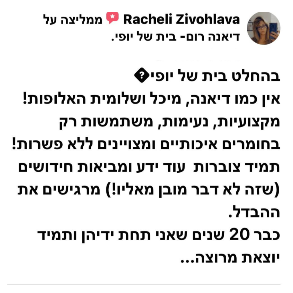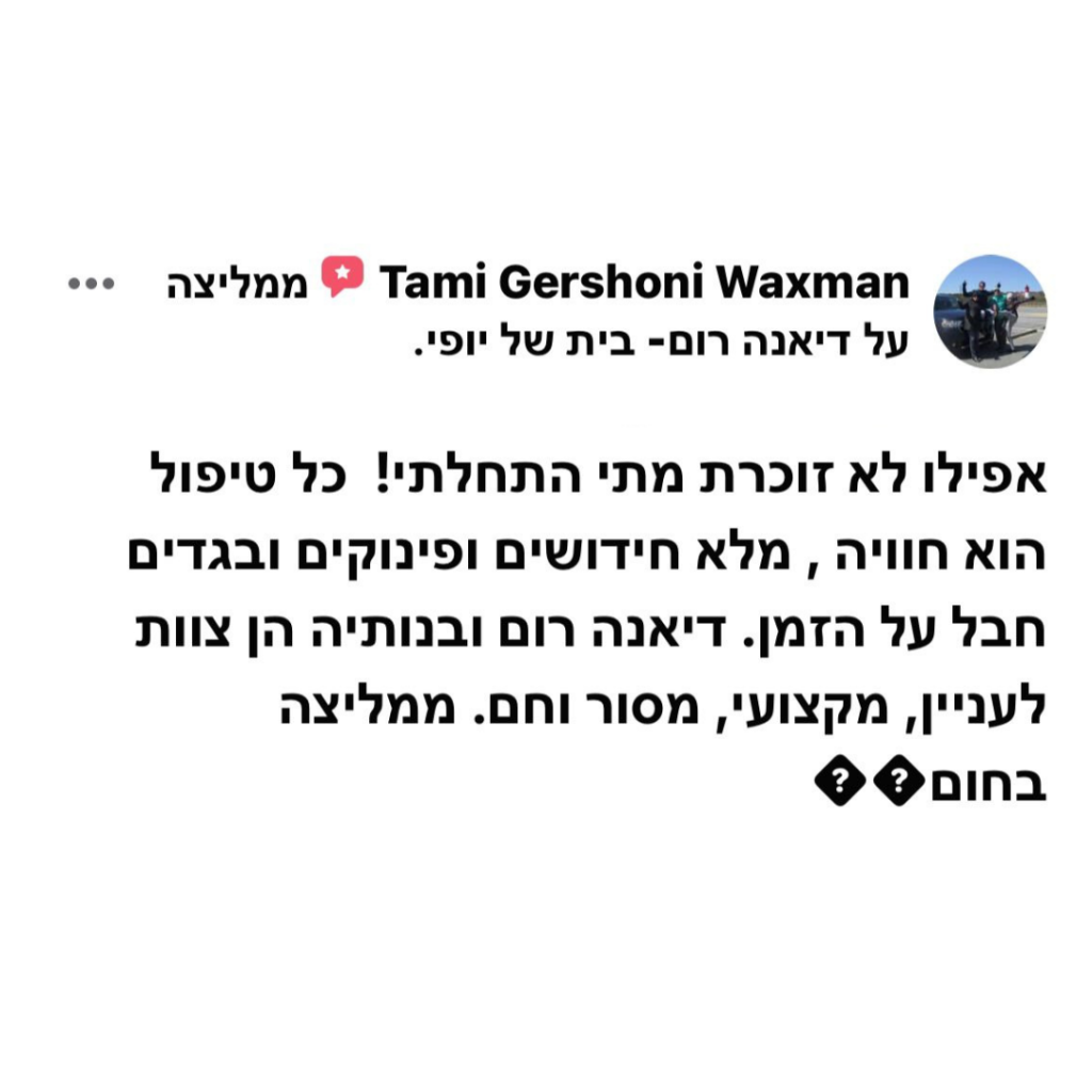 קליניקת היופי "דיאנה רום" הממוקמת באחד המקומות היפים בישראל, ביישוב עדי, מטפחת את לקוחותיה במקצועיות הגבוהה ביותר קרוב ל-30 שנה וביחס אישי וחם.
